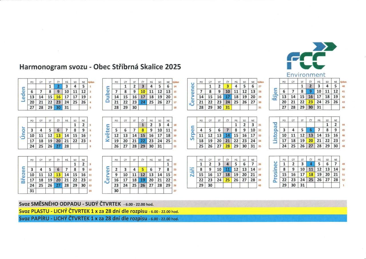 Harmonogram svozů Stříbrná Skalice 2025